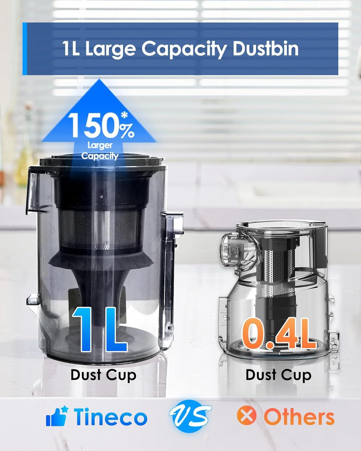 1L Larger Capacity Dustbin:The large 1L dust bin is 150% bigger than the bin on the Tineco A10. No need to frequently empty the dust bin while cleaning the entire house.