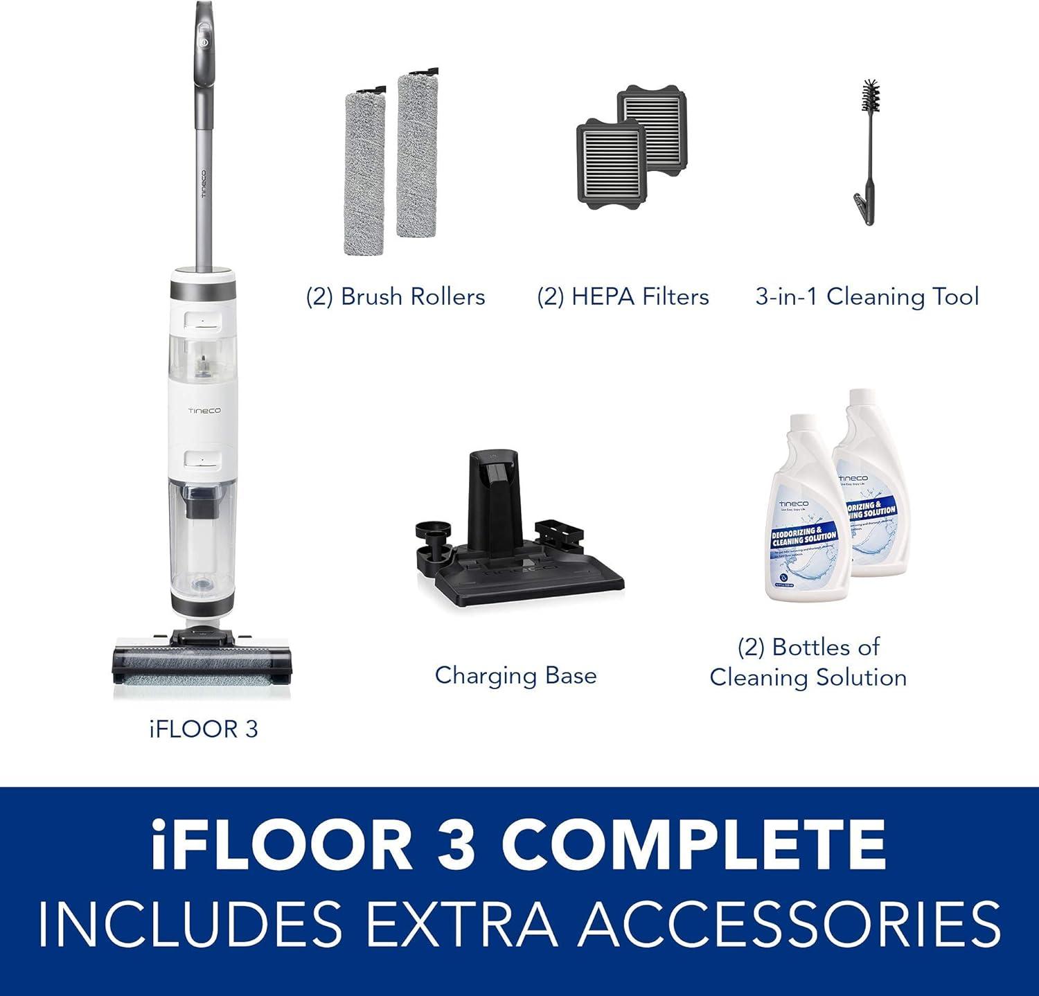 This special COMPLETE edition of iFloor 3 includes an enhanced accessory pack with (2) roller brushes, (2) HEPA filters, and (2) bottles of Tineco Deodorizing and Cleaning Solution, so you're always ready to tackle the next sticky mess.